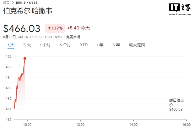 IT之家 8 月 28 日消息,美股今日开盘,伯克希尔哈撒韦 B 股价一路上涨,目前已经突破 466 美元每股,公司市值首次突破 1 万亿美元(IT之家备注:当前约 7.12 万亿元人民币),反映出投资者对这家由“股神”沃伦・巴菲特用近 60 年时间打造的企业集团的信心。