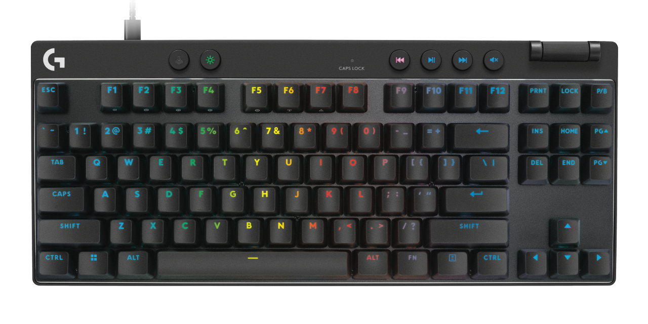 罗技 PRO X TKL RAPID 大体上延续了 PRO X TKL LIGHTSPEED 的整体模具设计,可选黑、白、粉三色,右上部配备媒体控制键和音量滚轮,但调整为仅支持有线连接,回报率为 1000Hz。