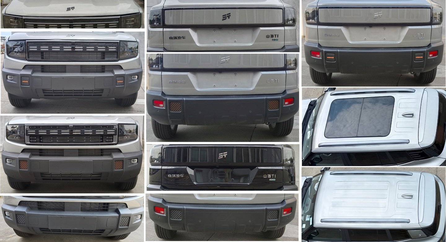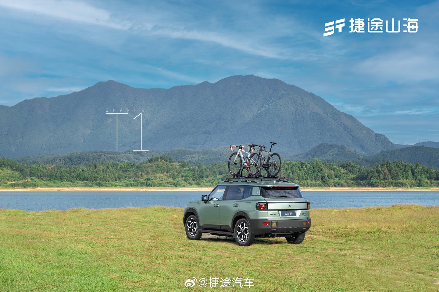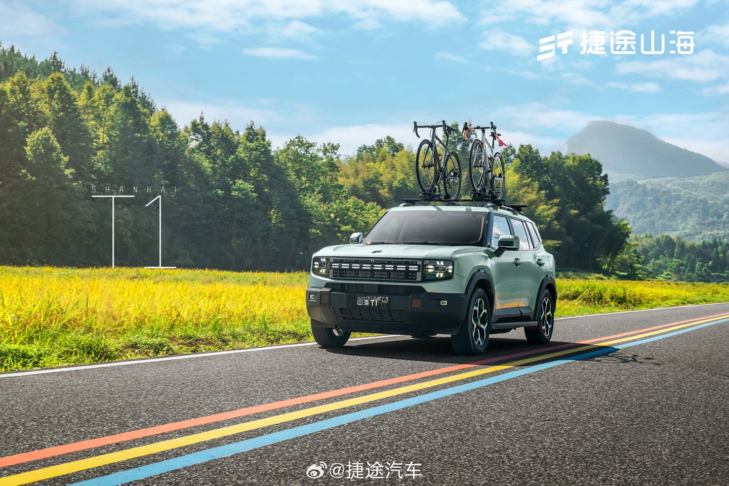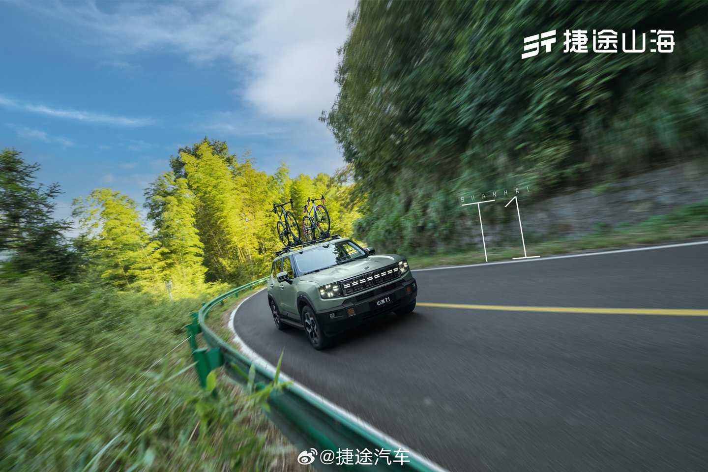 该车沿用了捷途山海 T2 的家族设计,仍为“方盒子”式的硬派越野造型,外观配备四点式日间行车灯和分段式的贯穿灯组,该车线条棱角分明,配备了车顶行李架和传统造型的门把手。从车顶摆放的自行车不难看出,新车将主打户外轻度越野的属性。