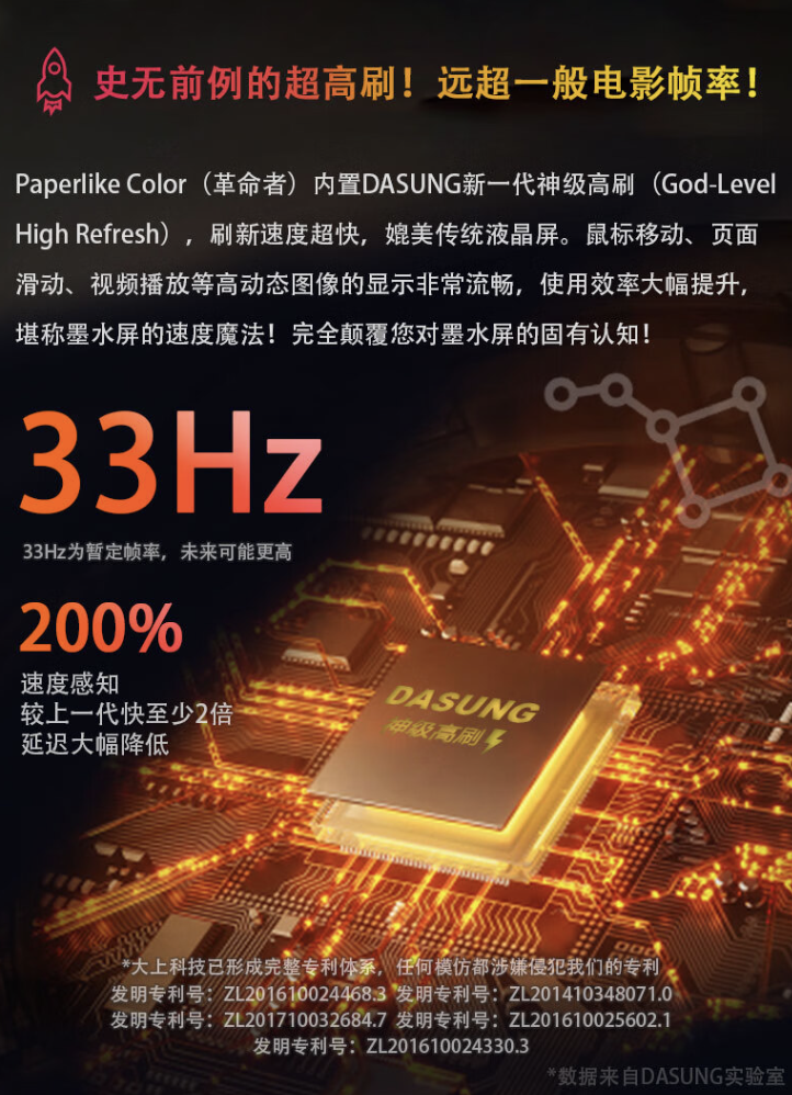 据介绍,这款显示器内置了大上科技最新一代创纪录的 33Hz 高刷技术,支持“X-Color 原色增强算法”和“Auto-Clear 残影自动抑制算法”,大上科技表示,对墨水屏来讲 33Hz 刷新率非常惊人,实验室取得的成绩还能更高,但量产开售的显示器暂定此数。