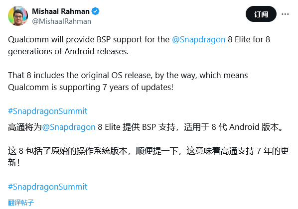 来自 Android Authority 的编辑 @MishaalRahman 随后转发该推文,额外表示高通骁龙 8 至尊版支持 BSP,适用于 8 代安卓版本。