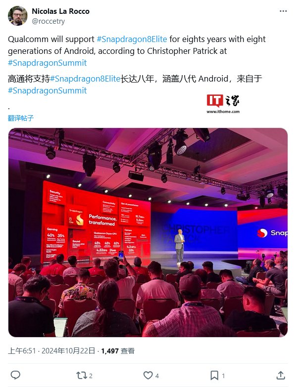 IT之家 10 月 22 日消息,消息源 @roccetry 今天(10 月 22 日)在 X 平台发布推文,表示高通公司 Chris Patrick 在 2024 骁龙峰会上,宣布骁龙 8 至尊版芯片将支持 8 年安卓版本更新。