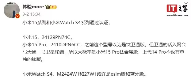 据IT之家此前报道,上月底,一款型号为 M2424W1 小米新品在工信部完成入网,搭载 Xiaomi HyperOS,支持独立 eUICC 芯片的 eSIM 技术。同月初,M2424W1 和 M2427W1 两款小米产品便通过了工信部无线电核准。有博主表示,这两款产品预计为小米 Watch S4 系列,区别或许是 eSIM 版和蓝牙版。