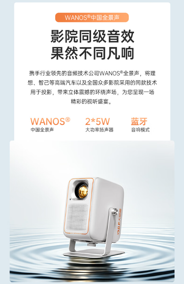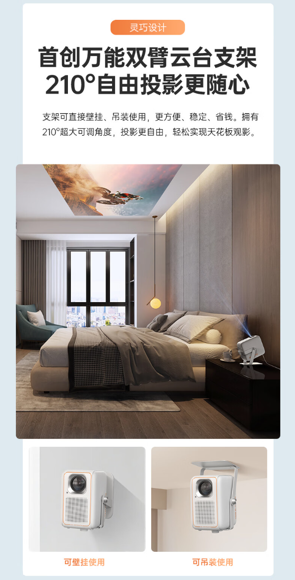 大眼橙 C1D 高亮版还配备万能双臂云台支架,可壁挂、吊装;投影仪标配 2+32GB 内存组合,配备 2*5W 扬声器,支持 WANOS 中国全景声。