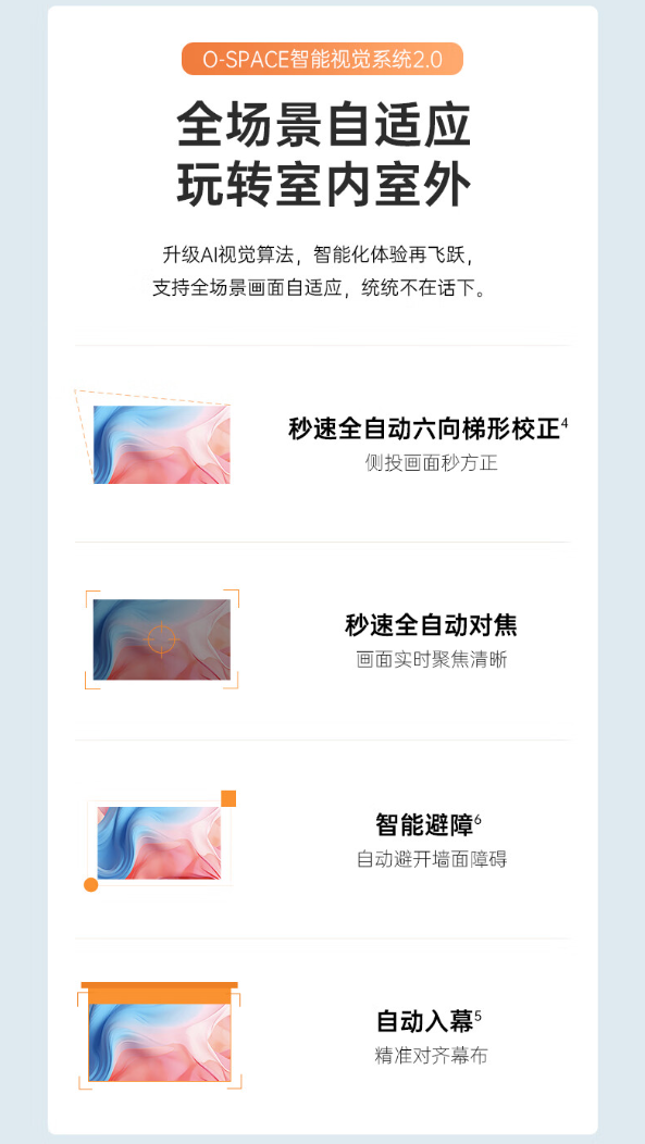 该款投影仪支持 HDR10,对比度 2800:1,内置 TV-FEEL 画质引擎 3.0,通过 SGS 低蓝光认证。投影仪还支持六向梯形校正、全自动对焦、自动入幕、智能避障等功能。