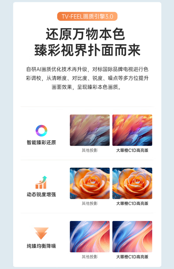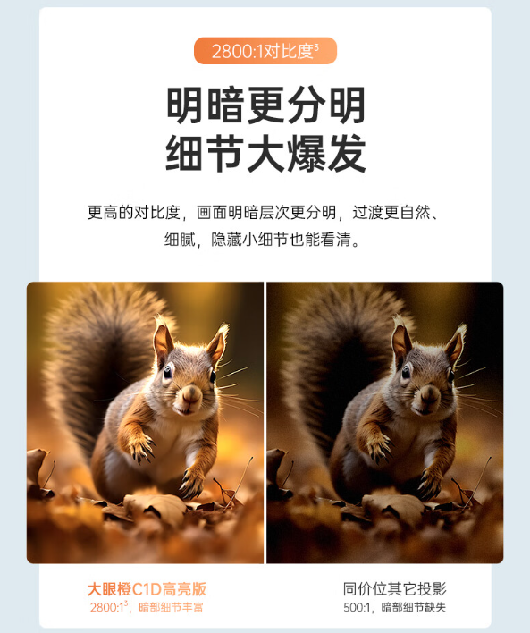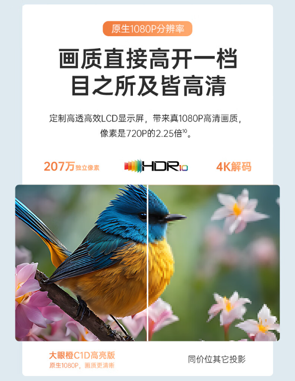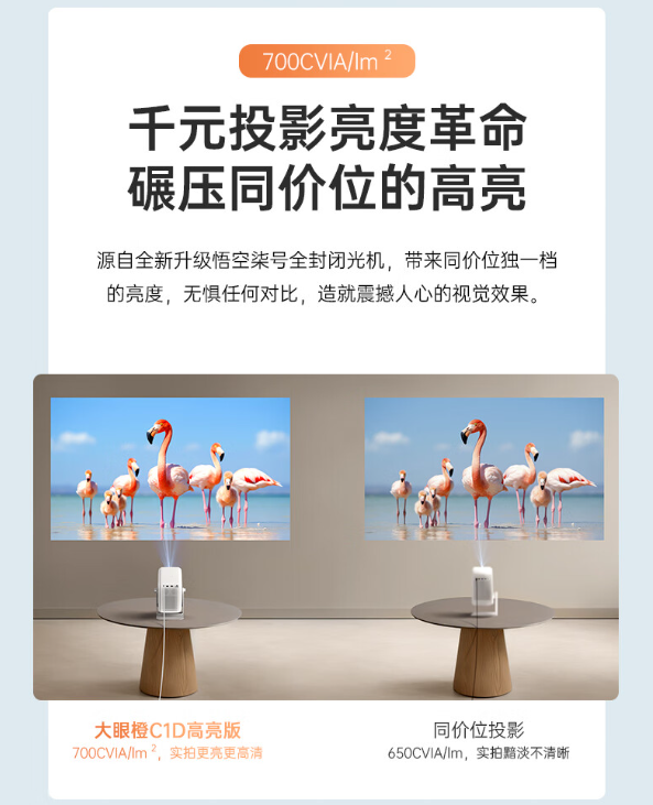据介绍,大眼橙 C1D 高亮版投影仪采用自研新一代全封闭式光机 + 高亮 LED 灯 + 华星光电 LCD 屏,亮度达 700CVIA / lm²,拥有原生 1080P 分辨率。