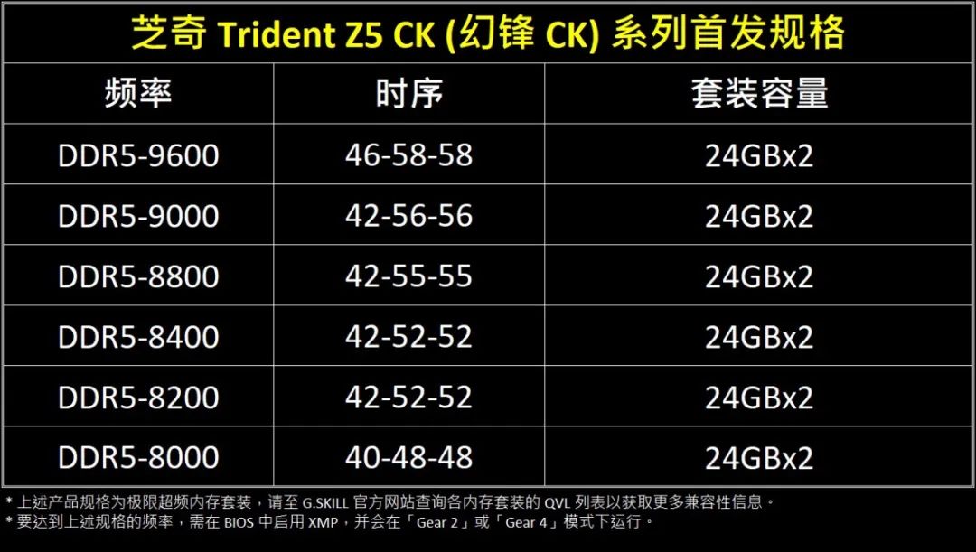 每个 Trident Z5 CK 模组均搭载 Clock Driver(CKD)芯片,提升内存模组在高速运作下的稳定性。全系列从 DDR5-8000 起,最高至 DDR5-9600(Gear 4)套装,其中 DDR5-9600 套装已在北美 Newegg 上架: