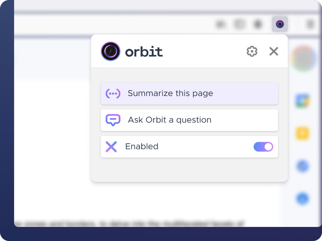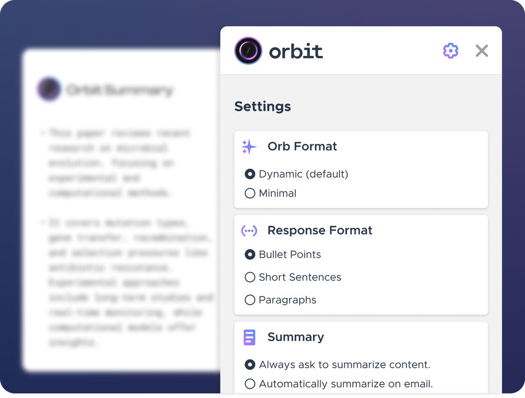Orbit 除了可以一键摘要当前页面内容之外,还内置聊天机器人,可针对页面内容进行提问,但不支持无关内容的查询。用户可自定义摘要格式(要点、简短概述或详细段落),并设置自动摘要功能。
