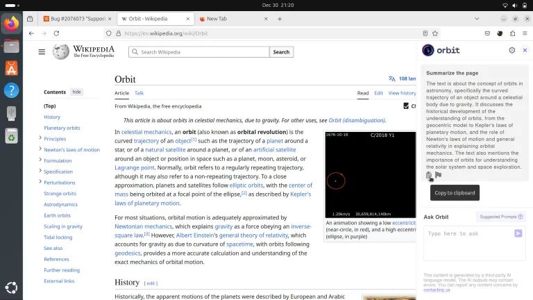 Orbit 由 Mistral 7B 大型语言模型(LLM)驱动,托管在云端。不过 Mozilla 承诺会妥善保护用户隐私,该助手无需登录或注册,不保留会话历史,查询数据不与 Mistral 7B LLM 或其他服务共享。