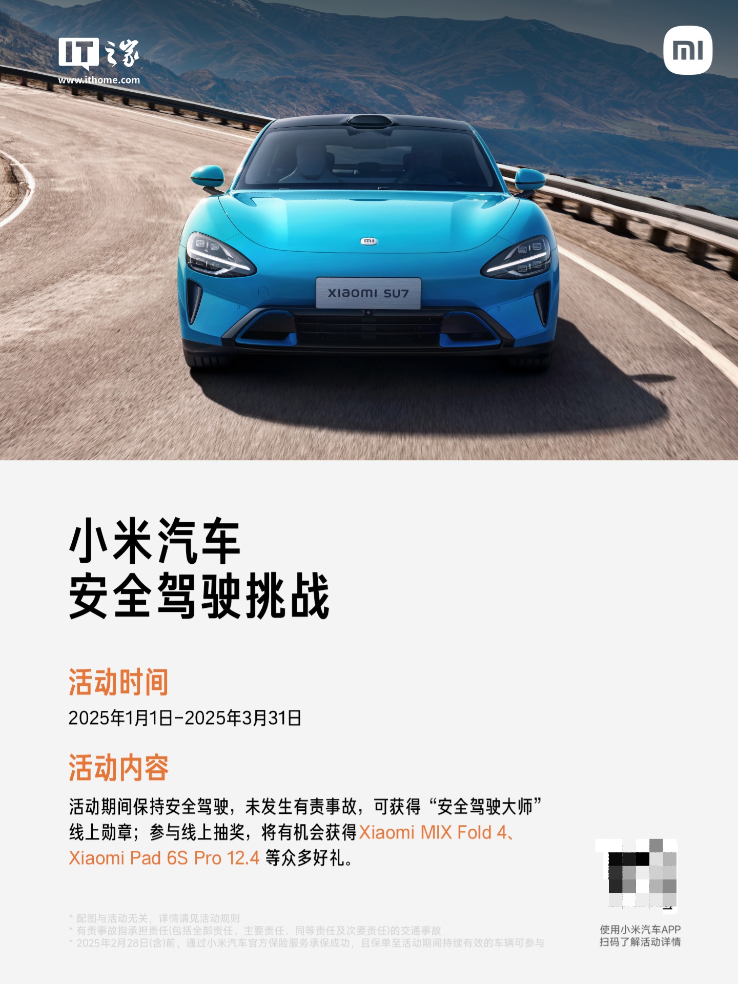 此次活动时间为 2025 年 1 月 1 日-2025 年 3 月 31 日,活动期间保持安全驾驶,未发生有责事故,可获得“安全驾驶大师”线上勋章。还可参与线上抽奖,将有机会获得 Xiaomi MIX Fold 4、Xiaomi Pad 6S Pro 12.4 等众多好礼。有责事故指承担责任(包括全部责任、主要责任、同等责任及次要责任)的交通事故。
