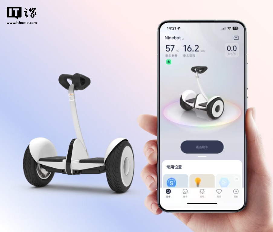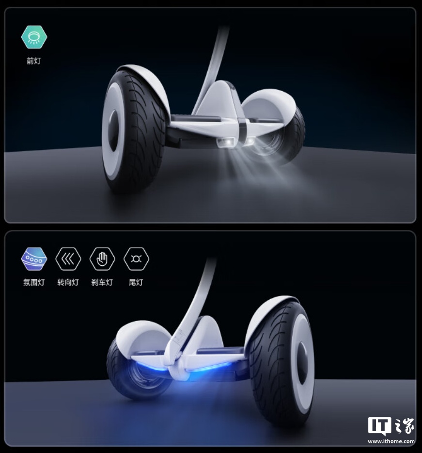 迷你九号平衡车还拥有转向提醒、刹车提醒、自定义氛围颜色灯效,配有 10.5 英寸防滑真空胎,可与 App 连接。