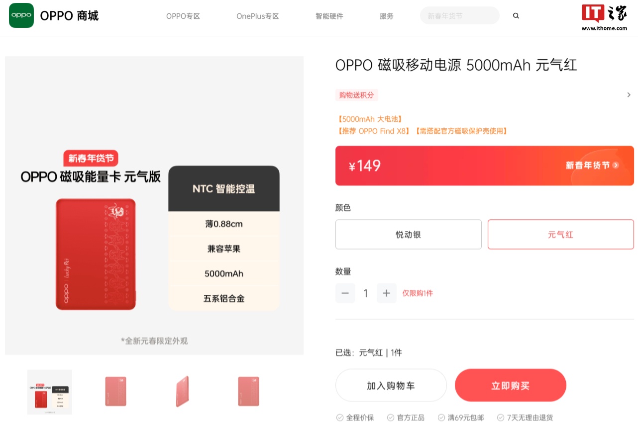 IT之家 1 月 1 日消息,OPPO 磁吸能量卡“元气红”配色现已上架官网,该款能量卡拥有 5000mAh 电池容量、兼容苹果 iPhone,售价 149 元。