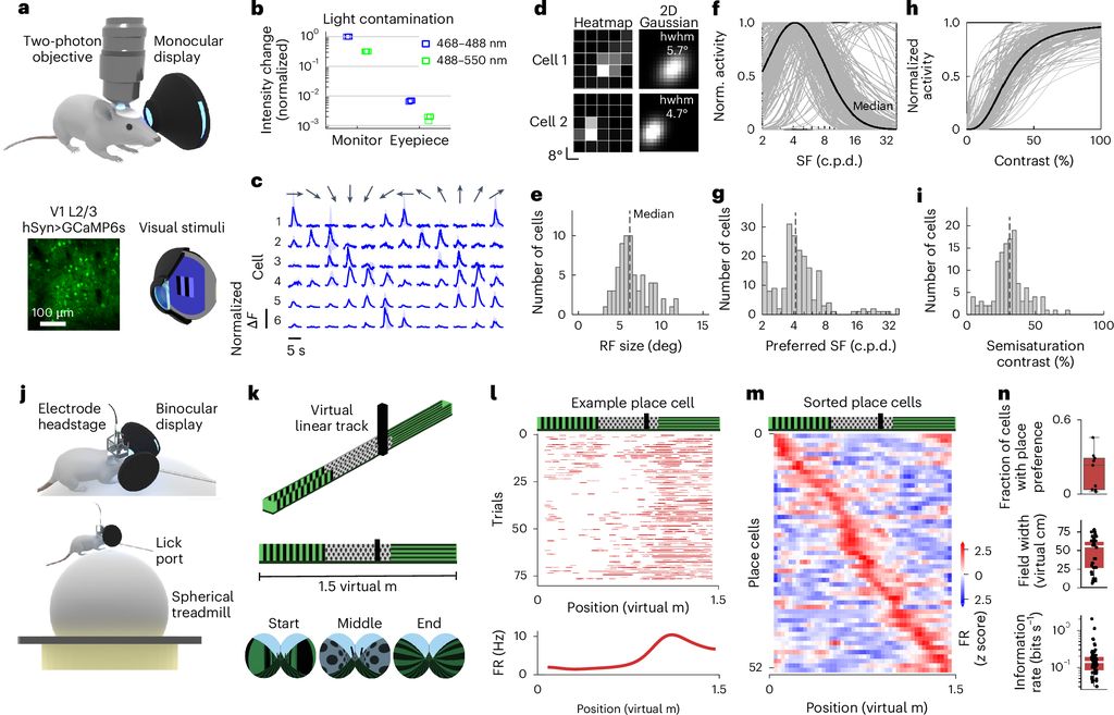 实验中,小鼠对虚拟捕食者的逼近表现出明显的惊吓反应,证明了 VR 环境的有效性。通过荧光追踪技术,研究人员观察到小鼠初级视觉皮层和海马体的活动,确认了护目镜能有效传输图像并帮助小鼠构建虚拟环境地图。