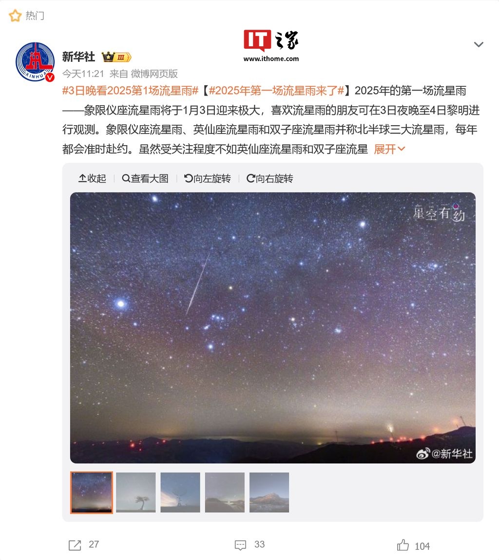 IT之家 1 月 2 日消息,2025 年的第一场流星雨 —— 象限仪座流星雨将于 1 月 3 日迎来极大,喜欢流星雨的朋友可在 3 日夜晚至 4 日黎明观测。