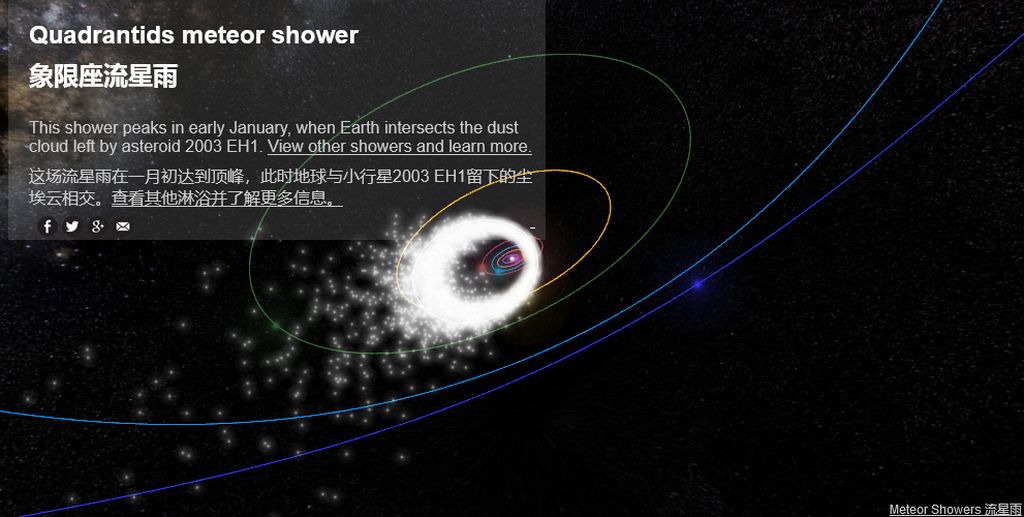 象限仪座流星雨是每年一月初出现的重要流星雨,与英仙座和双子座流星雨并称为北半球三大流星雨。不过 IMO 表示极大期通常时间较短(6 小时)和 1 月初的恶劣天气,同期情况下持续时间不会太久,但经常产生明亮的火球。