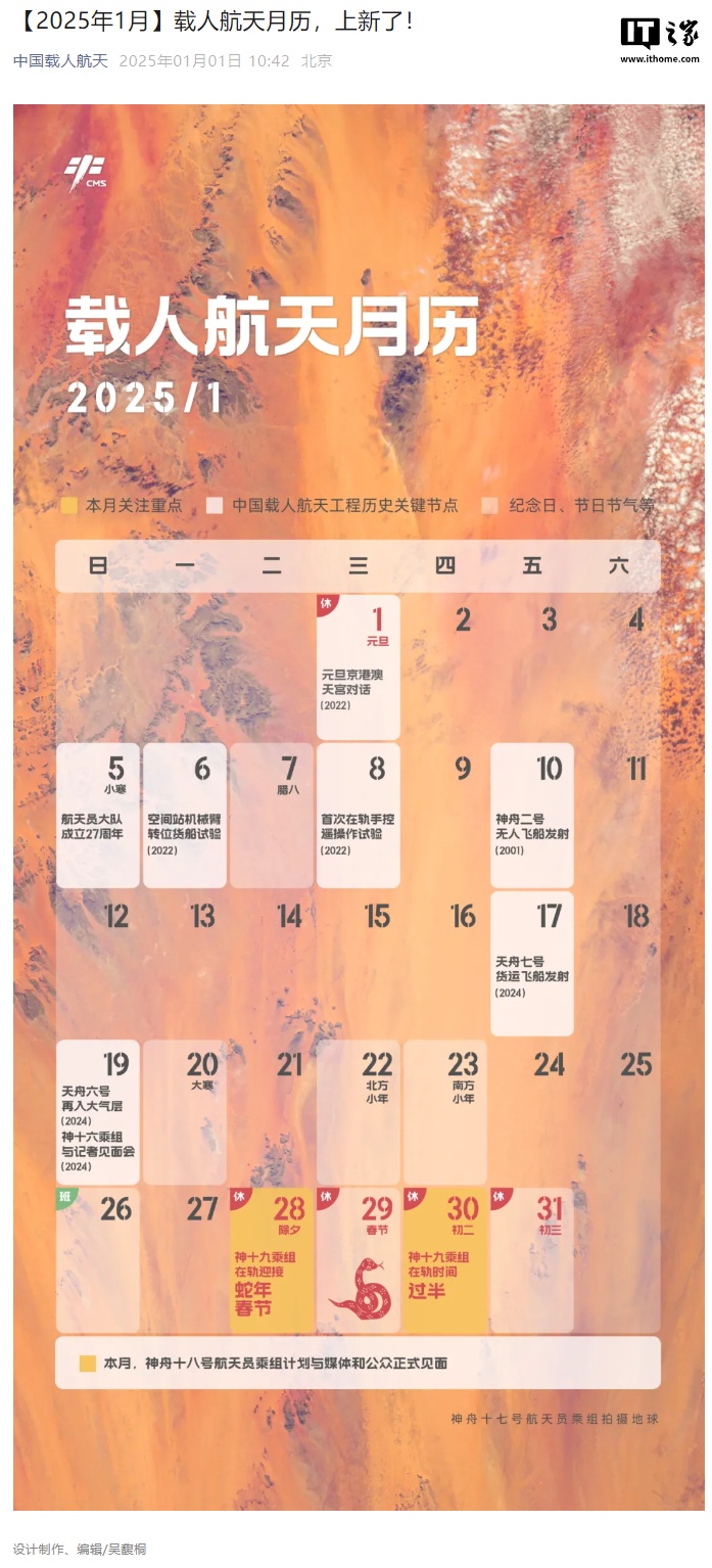 IT之家 1 月 2 日消息,新年伊始,中国载人航天工程办公室发布了 2025 年 1 月的“载人航天月历”,其中提到“本月,神舟十八号航天员乘组计划与媒体和公众正式见面”。