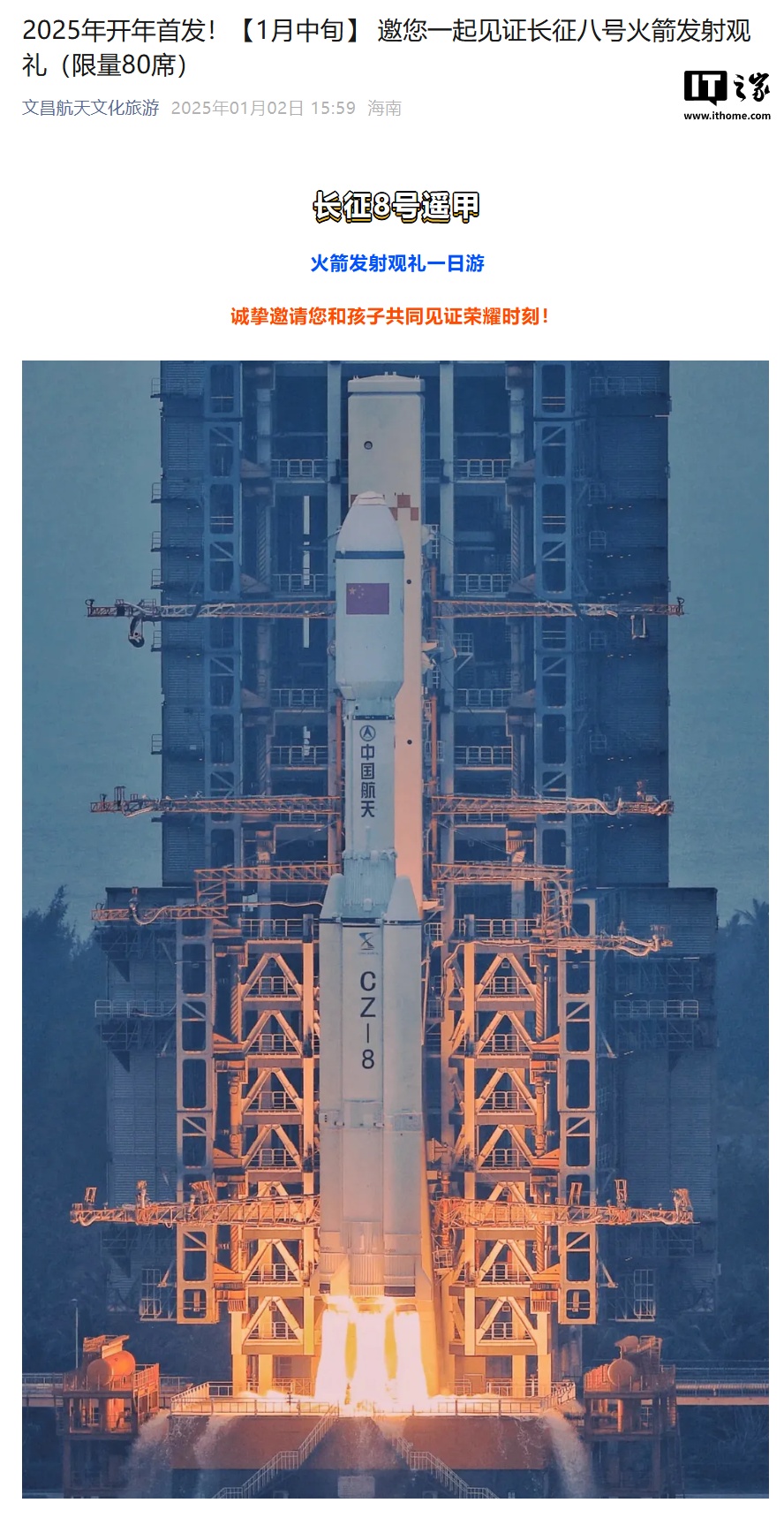 IT之家 1 月 2 日消息,据海南文昌航天文化旅游发展有限公司今日公布的消息,长征八号甲遥一运载火箭有望 1 月中旬发射,迎来 2025 年开年首飞。