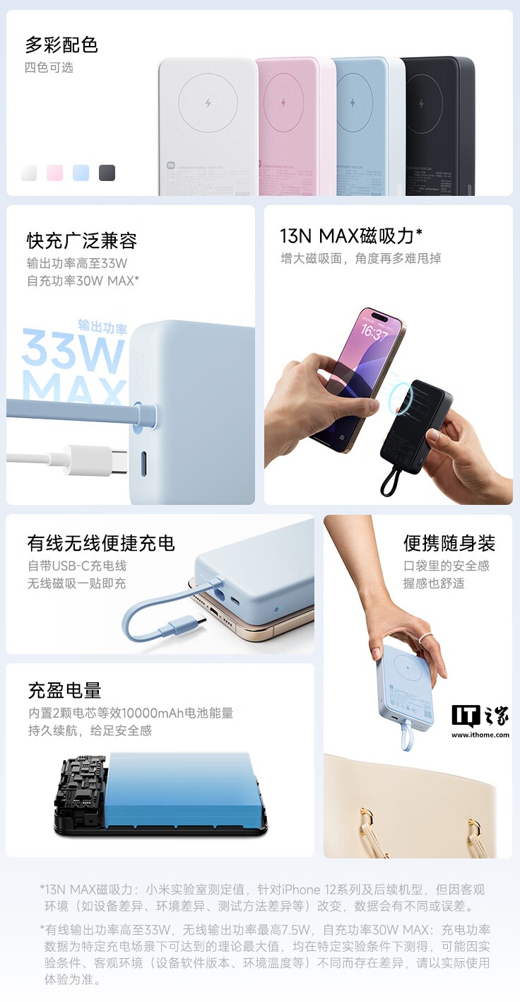 IT之家 1 月 2 日消息,小米磁吸自带线充电宝 10000 33W 今日开售,首销价格为 169 元,提供粉色、白色、蓝色、灰色四款配色。