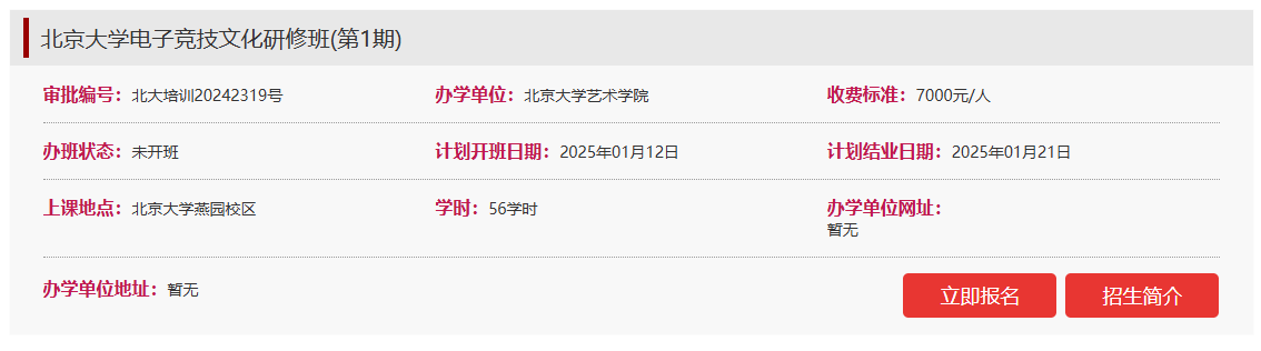 IT之家 1 月 2 日消息,北京大学继续教育部近日发布第 1 期电子竞技文化研修班招生简章,计划 2025 年 1 月 12 日开班,1 月 21 日结业,共 56 个学时课程,学费 7000 元 / 人。