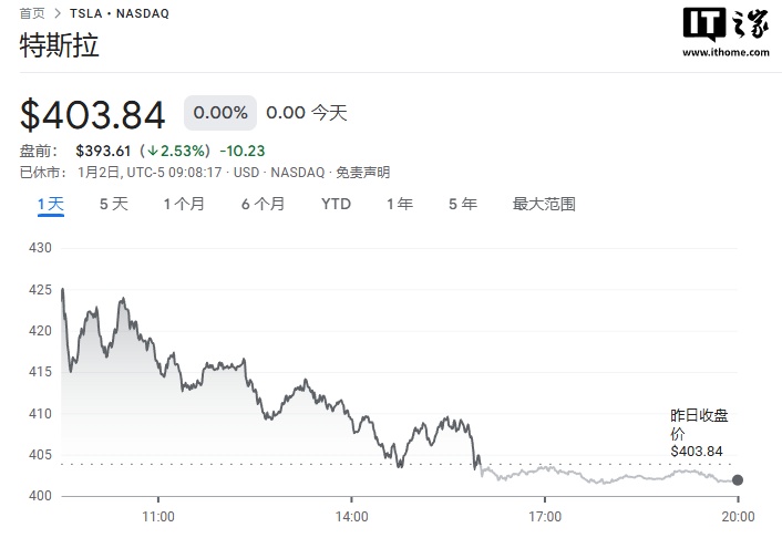 由于 Q4 交付量不及预期(484575 辆),再加上全年交付数据的下滑,特斯拉美股盘前股价一度跌至 5%,截至IT之家发稿跌幅已回升至 2.5% 左右。