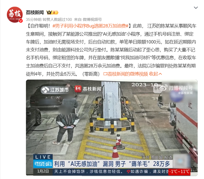 IT之家 1 月 3 日消息,据江苏城市频道《零距离》栏目 1 月 2 日报道,江苏的陈某某从事顺风车生意期间,接触到了某能源公司推出的“AI 无感加油”小程序,通过手机号码注册、绑定车牌后,加油时无需现场支付,后台自动扣款,单笔单日限额 1000 元,如在延迟期限内未支付油费,则由能源科技公司先行垫付。