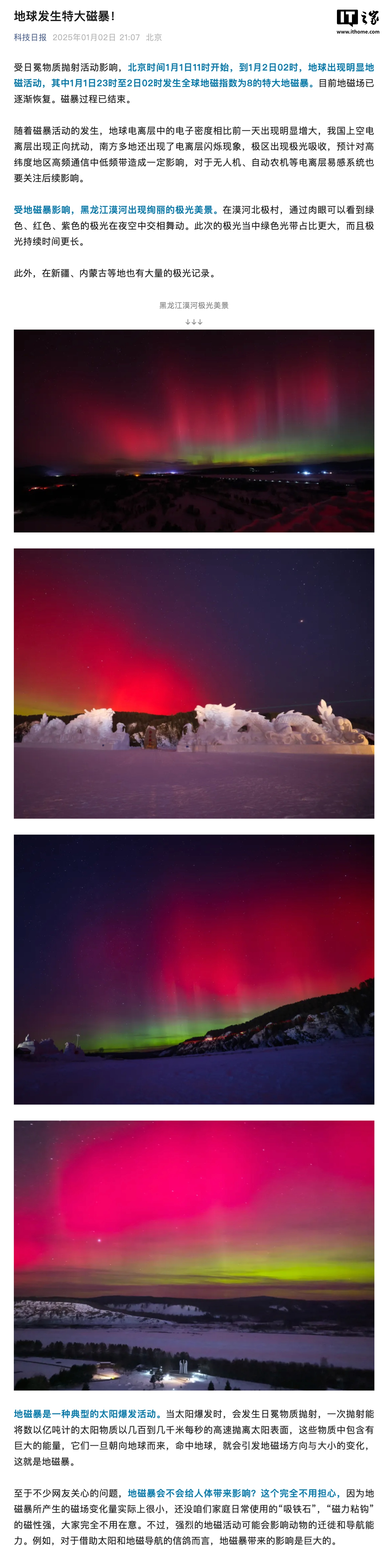 IT之家 1 月 3 日消息,据《科技日报》2 日报道,受日冕物质抛射活动影响,北京时间 1 月 1 日 11 时开始,到 1 月 2 日 02 时,地球出现明显地磁活动,其中 1 月 1 日 23 时至 2 日 02 时发生全球地磁指数为 8 的特大地磁暴。目前地磁场已逐渐恢复。磁暴过程已结束。