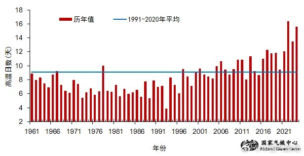 2024 年,全国平均高温(日最高气温≥35.0℃)日数达 15.6 天,较常年偏多 6.6 天,为 1961 年以来第二多,仅次于 2022 年。IT之家附上相关图片如下: