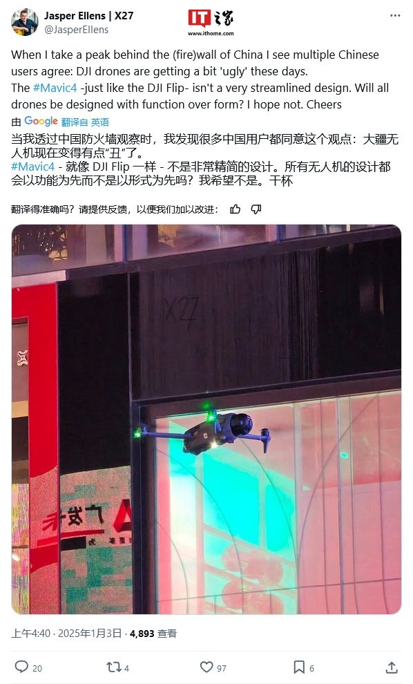 IT之家 1 月 3 日消息,消息源 Igor Bogdanov 和 Jasper Ellens 昨日(1 月 2 日)在 X 平台发布推文,分享了大疆 MAVIC 4 无人机的最新谍照,可以看到独特的球形相机系统,暗示该系列在相机方面会有重大更新。