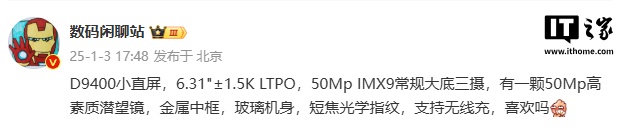 爆料显示,这款新机搭载天玑 9400 处理器,配备 6.31 英寸 ±1.5K LTPO 显示屏,后置 50Mp IMX9 常规大底三摄,有一颗 50Mp 高素质潜望镜。此外,该机还配备金属中框、玻璃机身、短焦光学指纹,支持无线充功能。