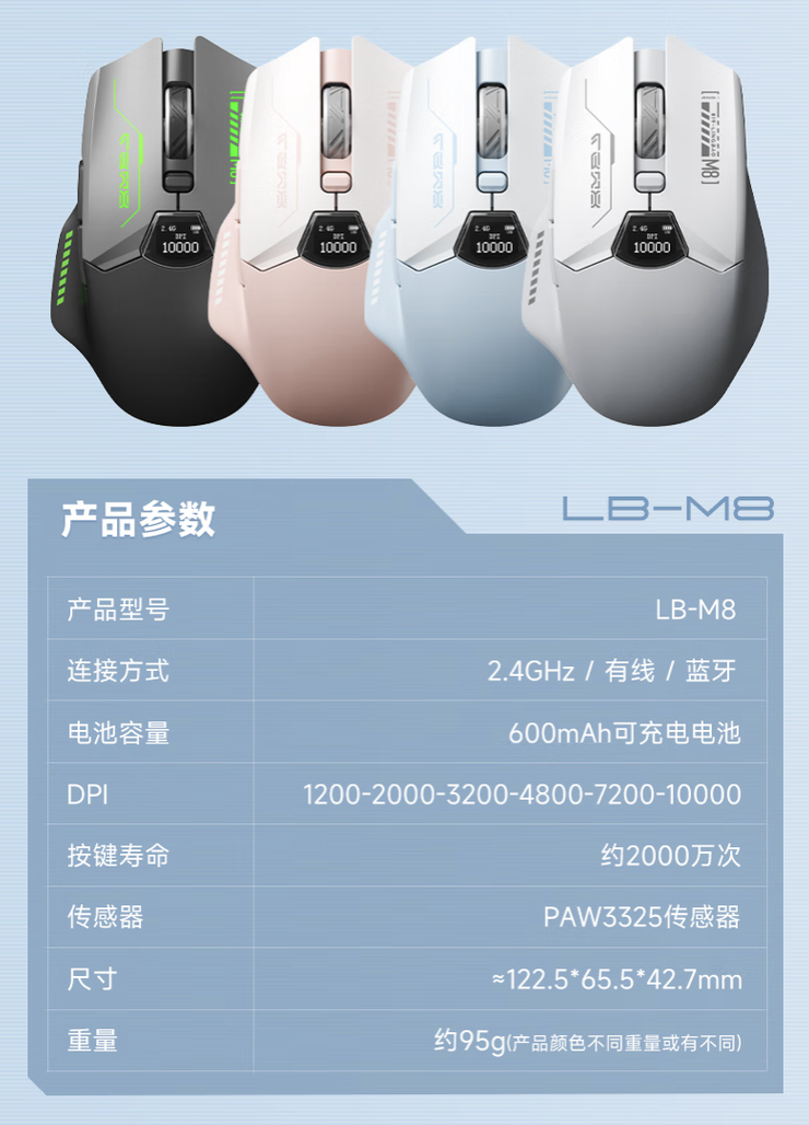 据介绍,这款鼠标整体重量 95 克,可选四种配色,鼠标正面配备 LED 屏幕,支持显示连接状态、DPI、鼠标电量。