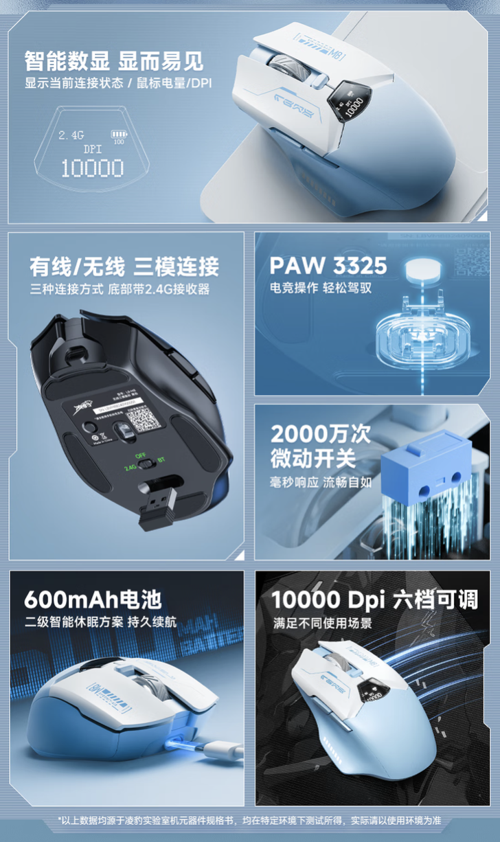规格方面,该鼠标配备 2000 万次环宇微动,采用 PAW3325 芯片,拥有 10000DPI,内置 600 毫安时电池。