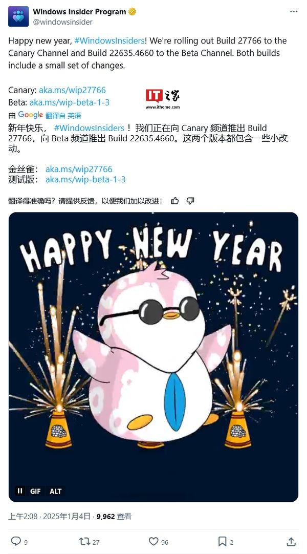 IT之家 1 月 4 日消息,微软公司昨日(1 月 3 日)发布博文,宣布面向 Canary 频道的 Windows Insider 项目成员,发布了 Build 27766 预览版更新。