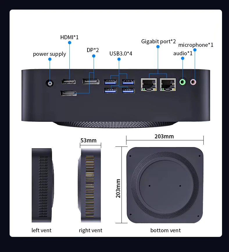 其尺寸为 203 x 203 毫米,高 53 毫米,正面一个接口都没有,背面提供了 HDMI 2.1、双 DP 1.4、四个 USB 3.0、双千兆网口以及 3.5mm 耳机孔,配备双独立麦克风,还支持 Wi-Fi 6 以及蓝牙 5.0。