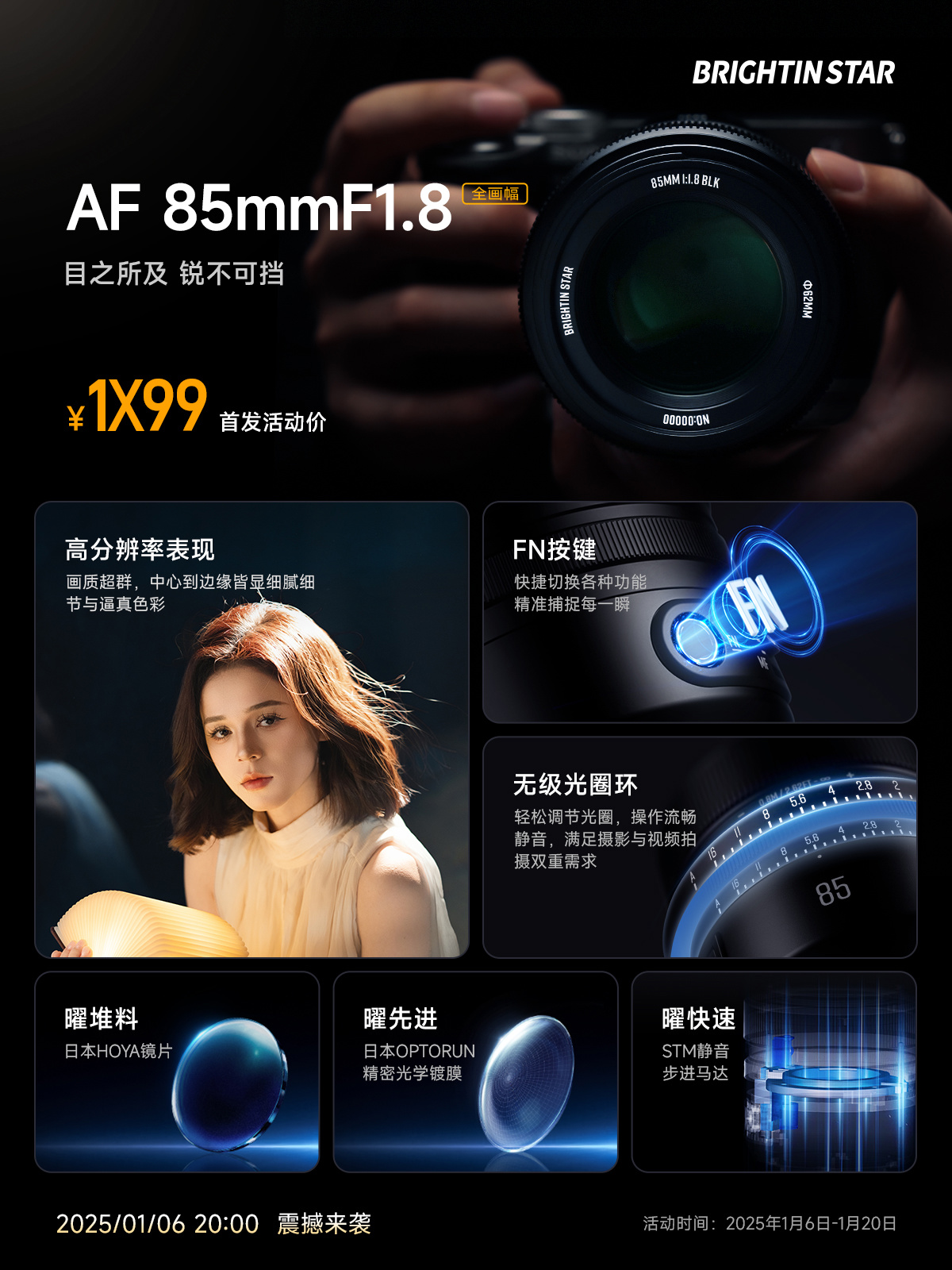 星曜 AF85mm F1.8 镜头采用日本豪雅 HOYA 光学镜片、日本光驰 OPTORUN 光学镀膜、STM 步进马达,拥有 62mm 滤镜接口,具备光圈环,具备自动 / 手动模式切换按钮、FN 按键。