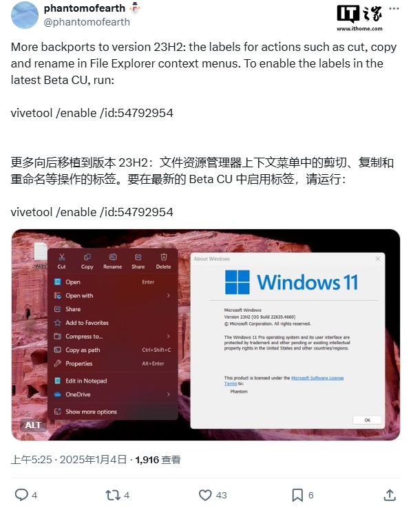 不过,Beta 频道中也不是所有人都能体验到这一新特性,而根据 @phantomofearth 分享的攻略,我们可以通过 vivetool 来主动启用这一新标签: