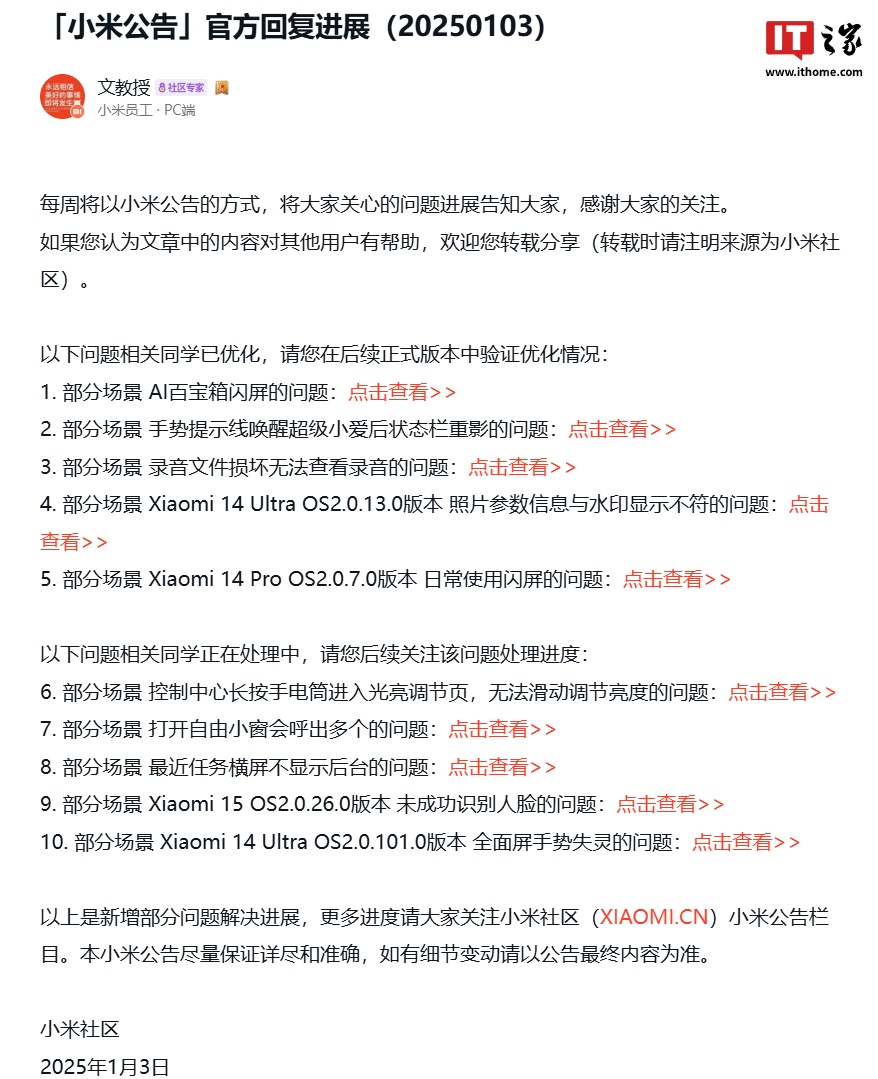 IT之家 1 月 5 日消息,小米官方本月(1 月 3 日)在小米社区发布公告,公布了澎湃 OS 2 Beta 问题优化进展,其中提到小米 14 Pro / Ultra 手机体验问题的优化情况。