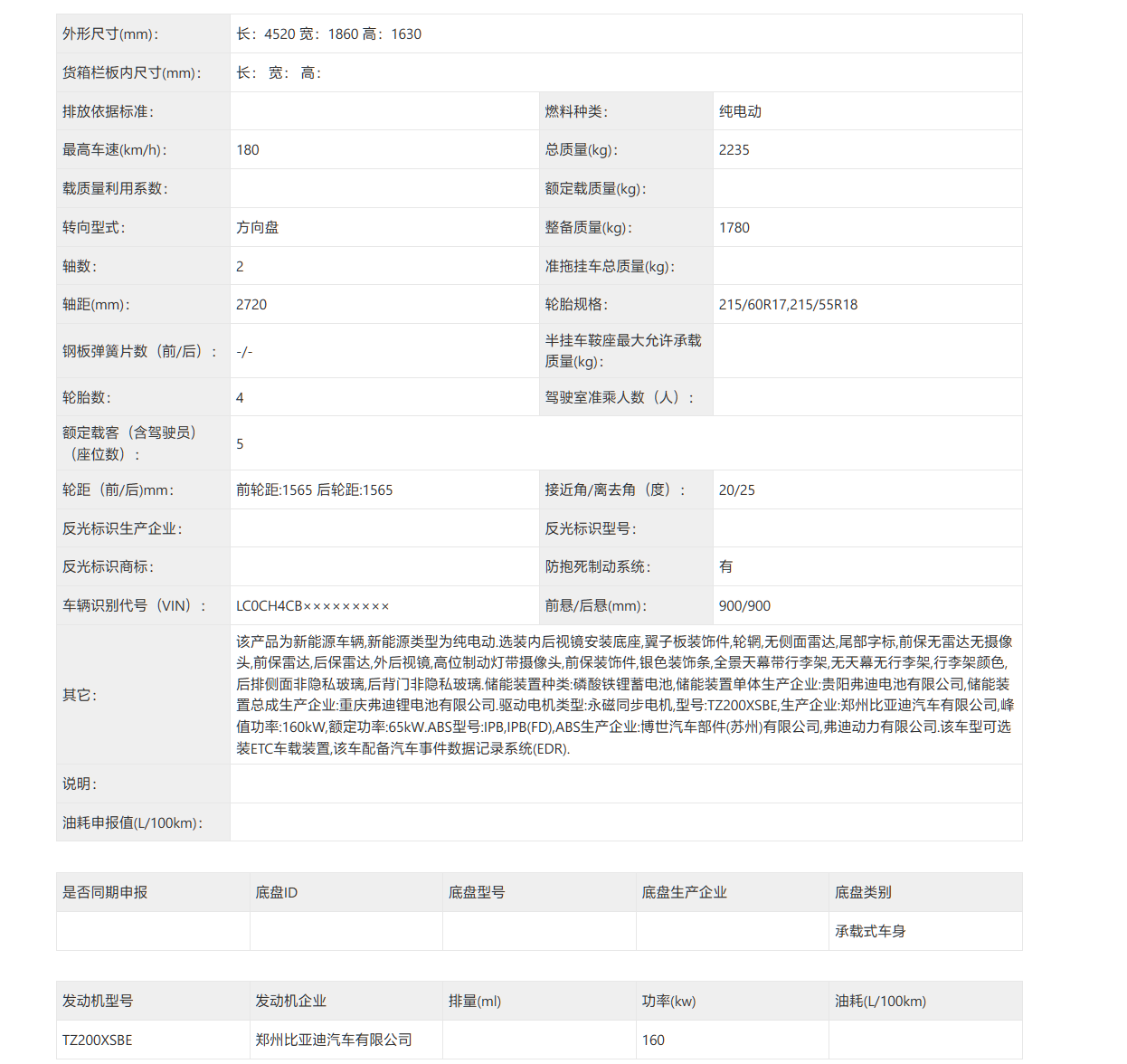 规格方面,该车长宽高分别为 4520 x 1860 x 1630 毫米,轴距 2720 毫米,从尺寸来看是一款紧凑型 SUV。该车整备质量 1780 千克,总质量 2235 千克。搭载功率为 160kW 的电机。