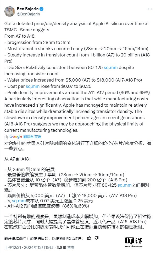 尽管技术进步带来的收益逐渐减少,芯片制造成本却大幅上涨。报告显示,晶圆价格从 A7 的 5000 美元攀升至 A17 和 A18 Pro 的 18000 美元,而每平方毫米的成本从 0.07 美元增加到 0.25 美元。巴贾林表示,这些数据来源于第三方供应链报告,并经过多方验证。尽管如此,非官方信息仍需谨慎对待。