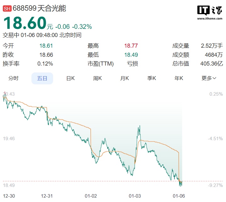 天合光能股份有限公司创立于 1997 年,主要业务包括光伏产品、光伏系统、智慧能源三大板块。截至IT之家发文,天合光能股价报 18.60 元 / 股,总市值 405.36 亿元。