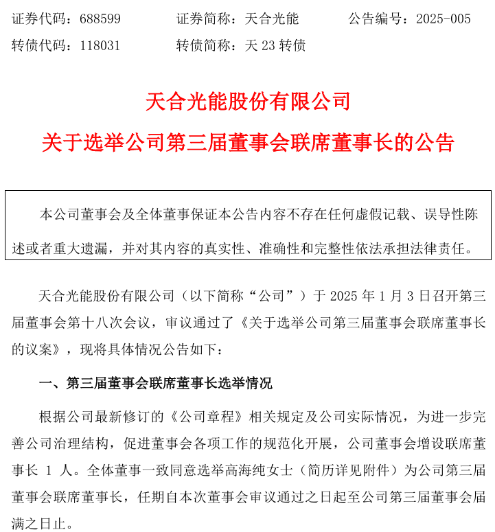 IT之家 1 月 6 日消息,天合光能 1 月 3 日晚发布公告称,全体董事一致同意选举高海纯为公司第三届董事会联席董事长。