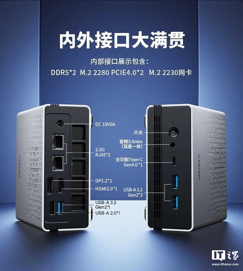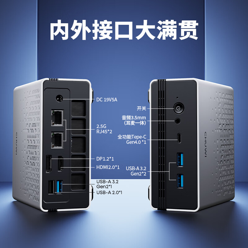 接口部分,驰为 UBox 采用 3 个 USB 3.0、一个 USB 2.0、一个 HDMI 输出接口、一个 DP 接口、两个 2.5G 网线接口、一个 3.5mm 耳机接口、一个全功能 Type-C 接口(可以用来外接显卡)。