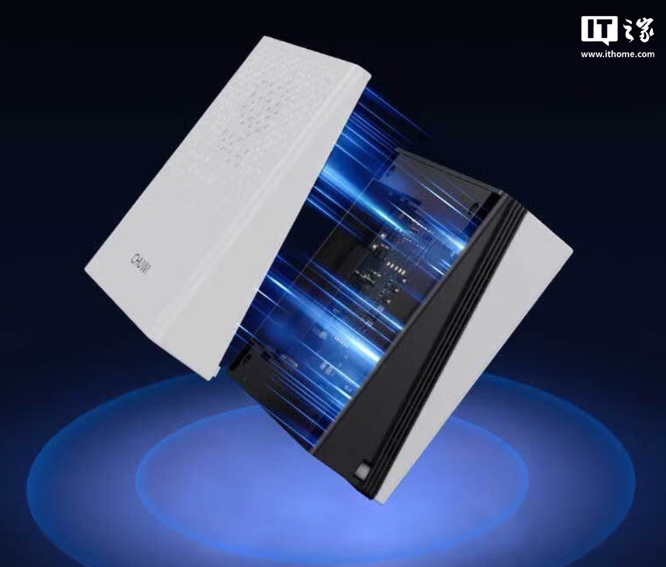 该机搭载双 PCIe 4.0 M.2 插槽,内存条采用 DDR5 双通道插槽,采用磁吸上盖方便拆装,预装 Windows 11 系统。