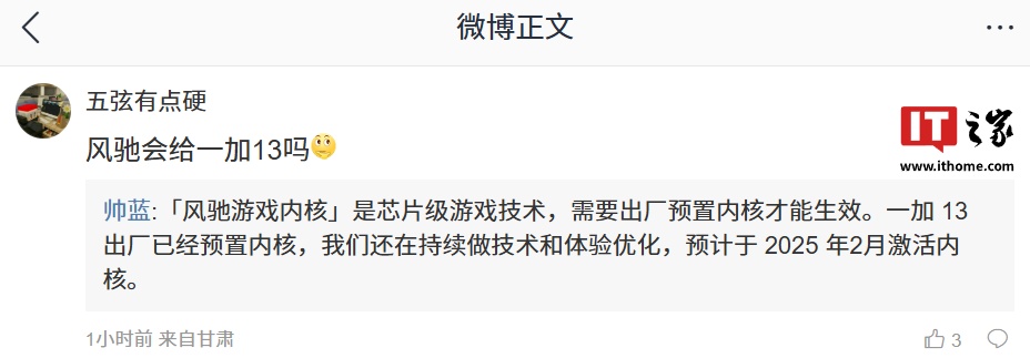 一加工作人员 @帅蓝 则针对「风驰游戏内核」是否会适配一加 13 手机的问题作出解答,他称「风驰游戏内核」是芯片级游戏技术,需要出厂预置内核才能生效。一加 13 出厂已经预置内核,我们还在持续做技术和体验优化,预计于 2025 年 2 月激活内核。