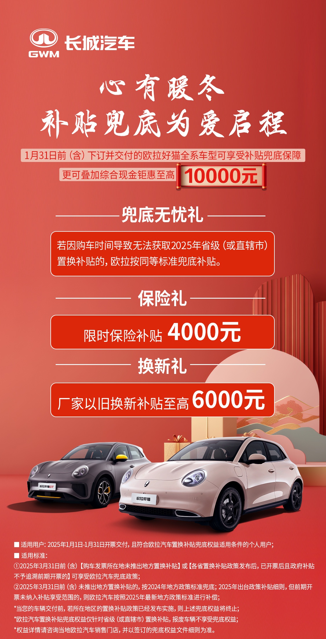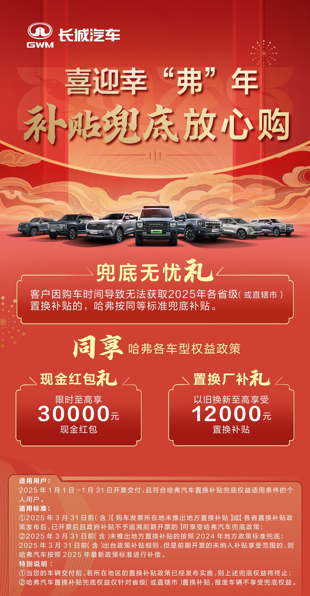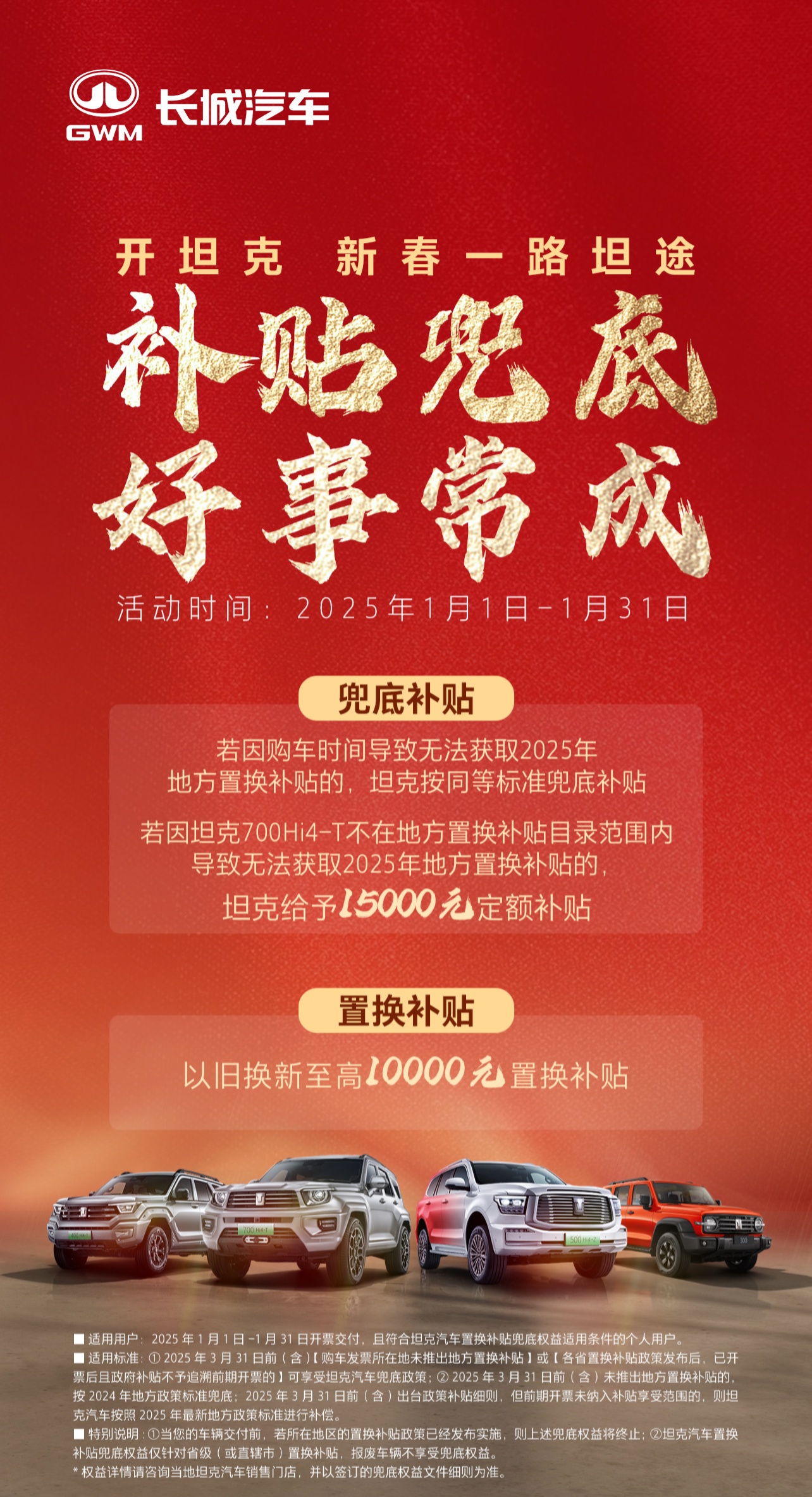 购买长城旗下哈弗、魏牌、欧拉、坦克各品牌车型,在 2025 年 1 月 1 日-1 月 31 日期间开票交付,且符合各品牌置换补贴兜底权益的个人用户,如因购车时间导致无法获得 2025 年各省级(或直辖市)置换补贴,各品牌按同等标准进行兜底补贴。