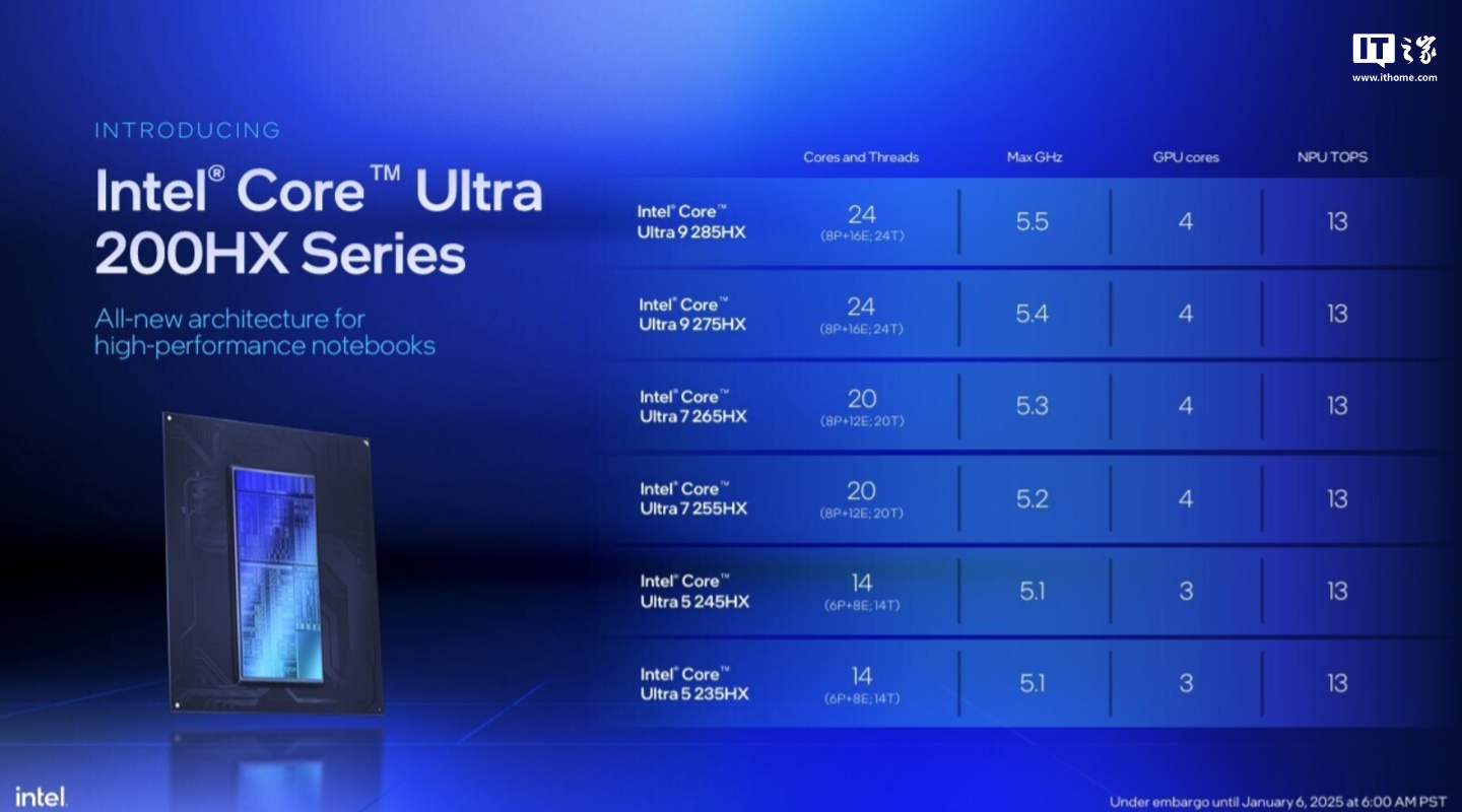 IT之家 1 月 6 日消息,英特尔在今日的 CES 2025 上发布了酷睿 Ultra 200HX 系列高性能移动处理器,新品用于游戏笔记本电脑和移动工作站等产品。