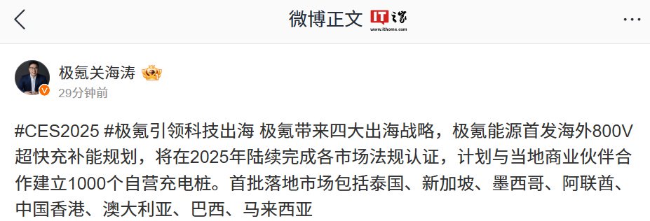 IT之家 1 月 7 日消息,极氪智能科技 CMO 关海涛今日发文称,极氪能源首发海外 800V 超快充补能规划,将在 2025 年陆续完成各市场法规认证,计划与当地商业伙伴合作建立 1000 个自营充电桩。首批落地市场包括泰国、新加坡、墨西哥、阿联酋、中国香港、澳大利亚、巴西、马来西亚。
