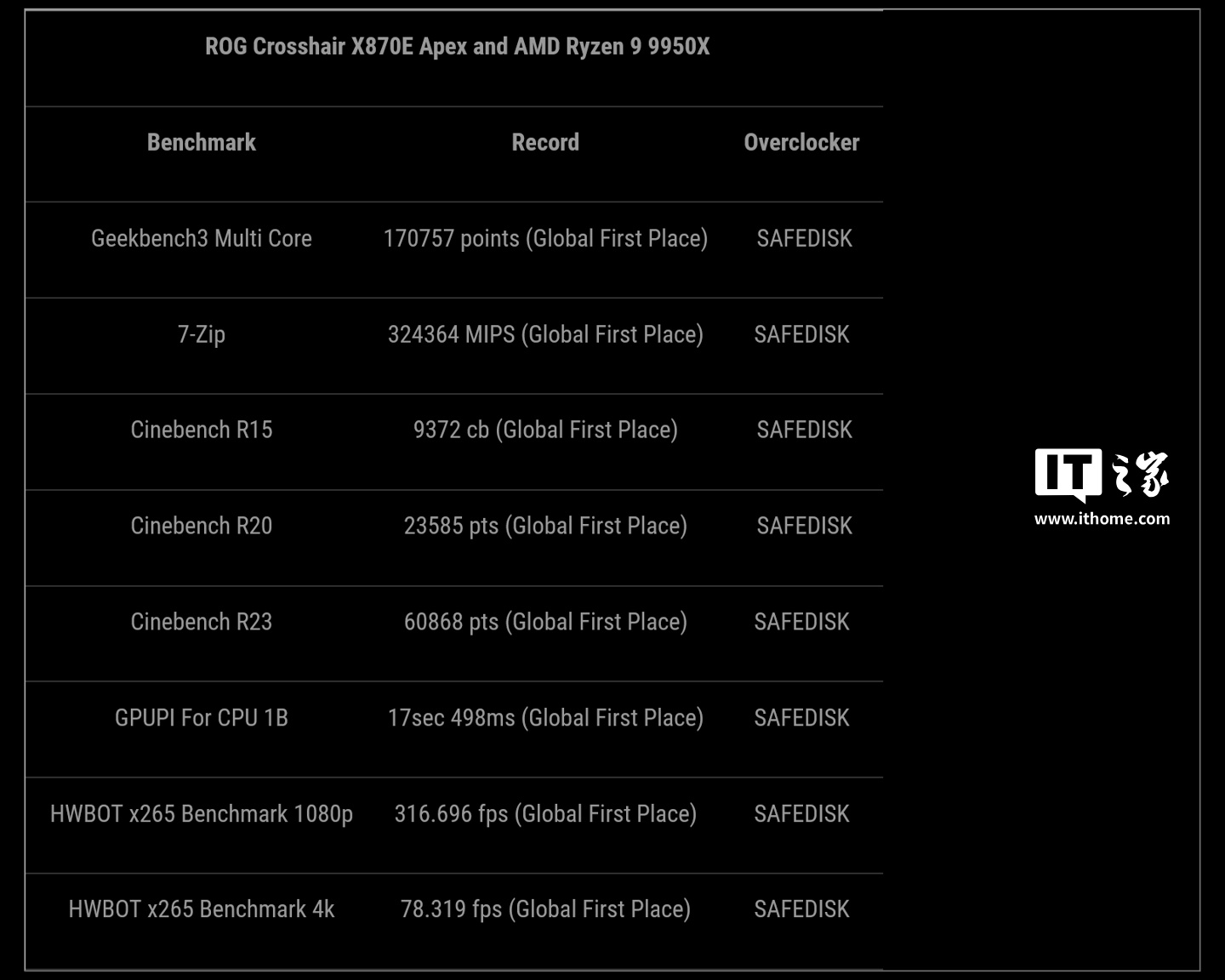 华硕表示 ROG CROSSHAIR X870E APEX 目前仍在开发阶段,计划在今年 1 季度末正式发布。不过该主板已以原型状态在超频大师 SAFEDISK 的手中同锐龙 9 9950X 一道拿下了 8 项全球第一。