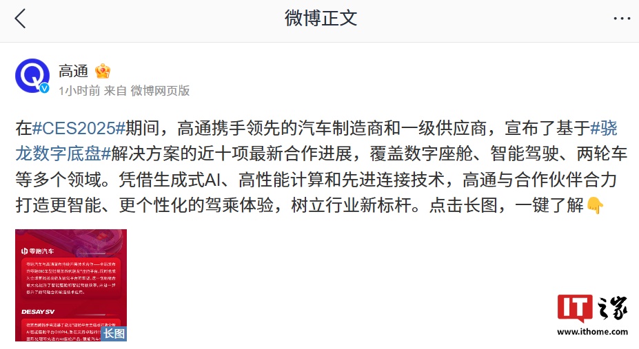 IT之家 1 月 7 日消息,高通技术公司今日发文宣布了基于“骁龙数字底盘解决方案”的近十项新合作,覆盖数字座舱、智能驾驶、两轮车等领域。