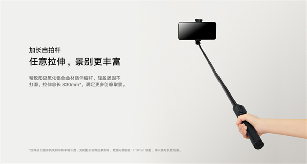 据IT之家了解,小米变焦支架自拍杆 2 采用阳极氧化铝合金材质伸缩杆,拉伸总长 830mm,搭配升级版锌合金伞骨结构三脚架,加宽加厚材质更稳固,二级拉伸设计增加底盘受力面,让支撑更稳定。