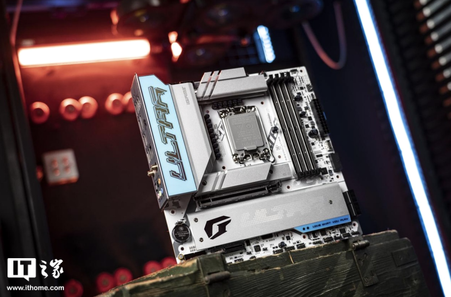 官方仅重点介绍了 iGame B860M ULTRA 主板,这款主板以“波普”为主题风格搭配条漫元素,其覆有幻色铭板设计“iGame 冰片散热装甲”,号称能够在不同观察角度下呈现出五彩斑斓的“蓝”,该“散热装甲”搭配一根 6mm 热管连接模组,有助于提高散热效率。